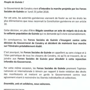 Dans un communiqué rendu public dans la nuit du dimanche 21 juillet 2018, Général Mathurin Bangoura gouverneur de la ville de Conakry interdit la marche des forces sociales de Guinée (FSG) prevue ce lundi 22 juillet, cela après que les maires des différentes communes concernées aient autorisés cette marche.