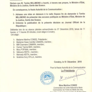 Cette décision vient de klaxonner devant nos portes! La (Haute Autorité de la communication), (HAC) met en demeure la radio Espace Fm de demander à son journaliste Tamba Zachari Millimouno, de présenter des excuses publiques, à Maitre Cheick Sacko, ministre de la justice, garde des sceaux.