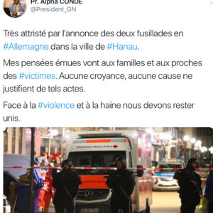 Tel est le tweet du président Guinéen. Un président émue et qui semble être très affecté par la perte de neufs citoyens allemands.