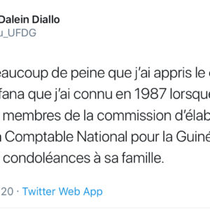 24« C’est avec beaucoup de peine que j’ai appris le décès de Louncény Fofana que j’ai connu en 1987 lorsque nous étions tous les deux membres de la commission d’élaboration d’un nouveau Plan Comptable National pour la Guinée » a-t-il souligné depuis son Twitter.