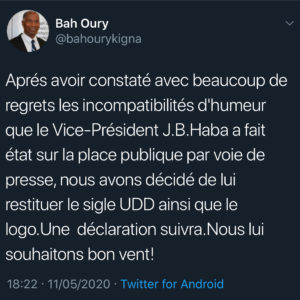 L’ex vice-président de l’UFDG décide enfin de tourner la page de l’UDD. Le conflit existant entre lui et Monsieur Haba, vice-président dudit parti ne lui a pas laissé le choix. A travers son Twitter, Monsieur Bah Oury annonce sa décision comme suit :
