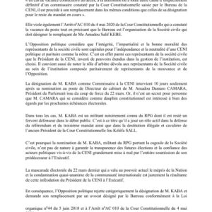 pour ces adverssaires politiques et membres de l’opposition Républicaine, cette désignation de M. KABA est illégale au regard de l’article 11 de la Loi organique N°44 du 5 juin 2018 portant organisation, attributions et fonctionnement de la CENI en vertu duquel : « en cas de vacance consécutive au décès, à la démission ou à toute autre cause d’empêchement définitif d’un commissaire constaté par la Cour Constitutionnelle saisie par le Bureau de la CENI, il est procédé à son remplacement dans les mêmes conditions que celles de sa désignation pour le reste du mandat en cours ».