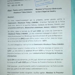 Urgent : Oumar Sylla (Foniké Manguê) dépose une plainte contre commissaire Fabou Camara DROIT & JUSTICE Par Frère Bah Le 18 Sep, 2020 | 17 h 46 min Partager Oumar Sylla (Foniké Manguê) a comme annoncé déposer une plainte contre le patron de la DPJ, commissaire Aboubacar Fabou Camara. Fonike Mengue accuse le patron de la DPJ d’avoir orchestrer son arrestation. Ci-dessous, la copie de plainte : A lire aussi : Élection présidentielle : la sanction avant le vote ! 15 Déc, 2025 | 18 h 00 min Affaire Mamady Camara : la CRIEF renvoie l’examen du dossier… 15 Déc, 2025 | 14 h 19 min Alas Toure Post Views: 391 Partager :FacebookXJ’aime ça :J’aime chargement… Articles similaires Partager