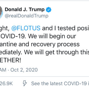 « Ce soir, @FLOTUS (la première dame des Etats-Unis) et moi-même avons été testés positifs pour le Covid-19. Nous allons entamer notre quarantaine et notre protocole de rétablissement immédiatement. Nous allons nous en sortir ENSEMBLE ! » a déclaré le président américain sur son compte Twitter.