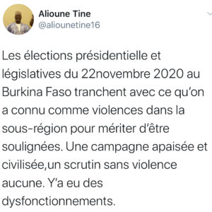 “ Les élections présidentielle et législatives du 22novembre 2020 au Burkina Faso tranchent avec ce qu’on a connu comme violences dans la sous-région pour mériter d’être soulignées. Une campagne apaisée et civilisée,un scrutin sans violence aucune. Y’a eu des dysfonctionnements.” A tweeté l’acteur sénégalais des droits humains.