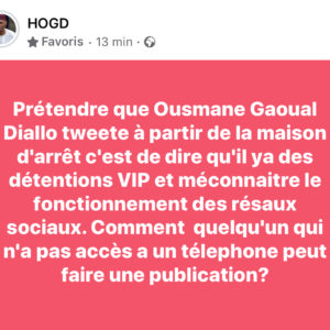 « Prétendre que Ousmane Gaoual Diallo tweete à partir de la maison d’arrêt c’est de dire qu’il ya des détentions VIP et méconnaitre le fonctionnement des résaux sociaux. Comment quelqu’un qui n’a pas accès a un télephone peut faire une publication ? »