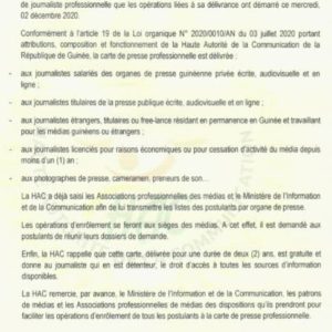 Guinée – Délivrance de la carte de presse : les précisions de la HAC (Communiqué) société Par Frère Bah Le 2 Déc, 2020 | 18 h 15 min Partager Dans un communiqué dont copie nous a été transmise la haute autorité de la communication (HAC) a annoncé ce mercredi 02 Décembre, le démarrage des opérations liées à la délivrance des cartes de presse professionnelle. Ci-dessous communiqué : GOM A lire aussi : Mamou accueille un atelier national stratégique sur les… 23 Avr, 2026 | 10 h 45 min Koloma : pose de la première pierre du siège de Simandou TV 22 Avr, 2026 | 13 h 01 min Post Views: 401 Partager :FacebookXJ’aime ça :J’aime chargement… Articles similaires Partager