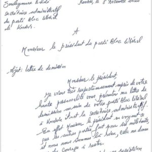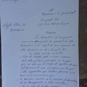 Je viens à travers cette présente vous signifier ainsi qu’à l’ensemble des responsables et militants du Bloc Liberal que j’ai décidé de démissionner du parti pour rendre le poste qui m’était confié en qualité de président de la Fédération de Labé.