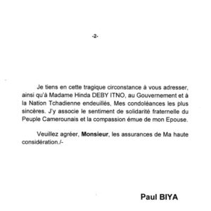 Le président Camerounais Paul Biya, a à travers son compte Twitter dans une note présenté annoncé que la disparition du Maréchal Deby est une grande perte l’Afrique. Il écrit: