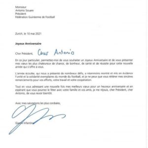 Le Président de la FIFA, Gianni Infantino, souhaite un joyeux anniversaire à Antonio Souaré (lettre)