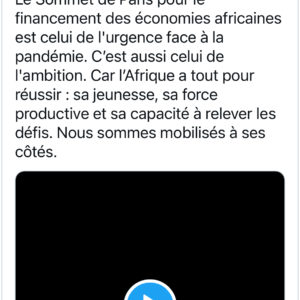 Toutefois, selon le Président français Emmanuel Macron « le Sommet de Paris pour le financement des économies africaines est celui de l’urgence face à la pandémie. C’est aussi celui de l’ambition. L’Afrique a tout pour réussir : sa jeunesse, sa force productive et sa capacité à relever les défis », a-t-il affirmé en ouvrant mardi un sommet international consacré à la relance économique de l’Afrique.