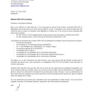 Dans un courrrier quelle a adressée à la Fédération guinéenne de Football (FEGUIFOOT), la FIFA à travers son directeur de division Association membres informe que la mission Fifa-Caf sera à Conakry du 21 au 24 juin prochain et rencontera le ministre des Sports et plusieurs autres personnes dont monsieur Amadou Diaby.