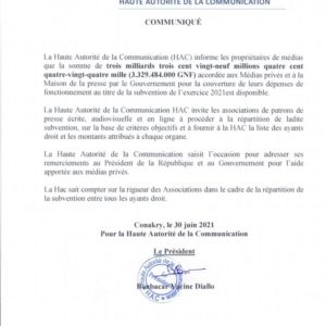 La subvention accordée aux médias et à la maison de la presse est désormais disponible a annoncé la HAC dans un communiqué. Une subvention d’un montant de trois milliards-trois-cent-vingt-neuf millions-quatre-cent-quatre-vingt-quatre-mille francs guinéens (3 329 484 000 GNF).