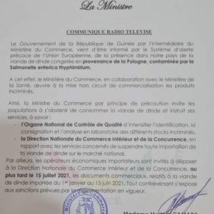 Le Gouvernement Guinéen alerte les citoyens de la présence de la viande de dinde contaminé dans le pays (copie) Par Hassane Diallo société Par Frère Bah Le 1 Juil, 2021 | 13 h 57 min Partager Post Views: 393 A lire aussi : La HAC suspend Kaback TV pour trois mois après des propos… 10 Déc, 2025 | 18 h 20 min Nouveau drame routier à Sougueta : plusieurs morts et un… 10 Déc, 2025 | 13 h 46 min Partager :FacebookXJ’aime ça :J’aime chargement… Articles similaires Partager