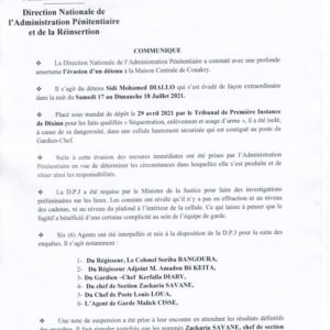 L’évasion de Sidi Mohamed Diallo de la maison centrale de Conakry continue a ses dessous. Dans un communiqué que nous avons reçu, le Ministère de la Justice annonce l’interpellation de certains complices présumés, et que deux membres de la garde penitentiaires , à savoir, Zackaria Savané et Malick Cissé restent activement recherchés.
