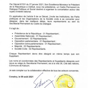 Dans un communiqué dont copie nous a été transmise, nous avons été tenus informé de la tenue ce jour 09 août 2021, sous la présidence du premier ministre, la concertation pour désigner les Représentants au sein du Secrétariat permanent du cadre du Dialogue effectuée .
