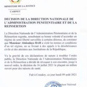 ” La Direction Nationale de l’administration pénitentiaire et de la Reinsertion regrette, nonobstant sa bonne volonté d’accorder un régime de semi-liberté surveillée à certains détenus, de constater que Monsieur Abdoulaye Bah a violé les termes et conditions de son régime de semi-liberté en se livrant à des appels à la désobéissance civile et des atteintes aux institutions de la République.” Peut-on lire dans cette décision.