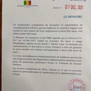 Dans le même courrier, la ministre Aminata Assome Diatta souligne, que les bailleurs et commissionnaires de bailleurs «sont tenus aux respects stricts des dispositions règlementaires susvisées sous peine de poursuites judiciaires devant le Tribunal de Grande Instance».