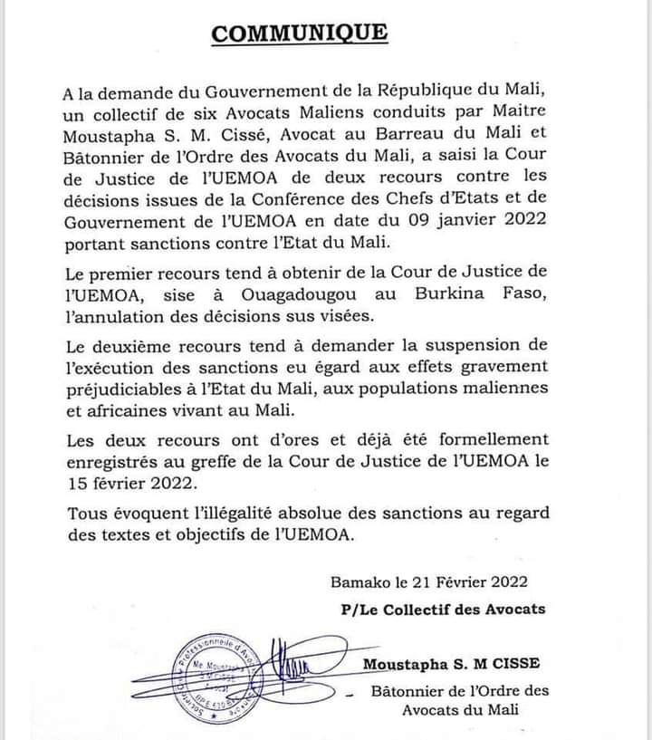 Les autorités maliennes portent plainte contre l’UEMOA (communiqué) Afrique Par Mariame Maïga Le 21 Fév, 2022 | 22 h 13 min Partager Le gouvernement Malien porte plainte contre l’UEMOA en saisissant la cour de justice de L’UEMOA contre les décisions issues de la conférence des chefs d’États de L’UMEOA portant sanctions contre l’Etat du Mali. Ci-dessous, la copie A lire aussi : Côte d’Ivoire : Ouattara démarre son 4e mandat en… 8 Déc, 2025 | 16 h 22 min Burkina Faso : le gouvernement rétablit la peine de mort… 6 Déc, 2025 | 7 h 56 min Post Views: 605 Partager :FacebookXJ’aime ça :J’aime chargement… Articles similaires autorités maliennes portentCommuniquécontrelesplainteUEMOA Partager