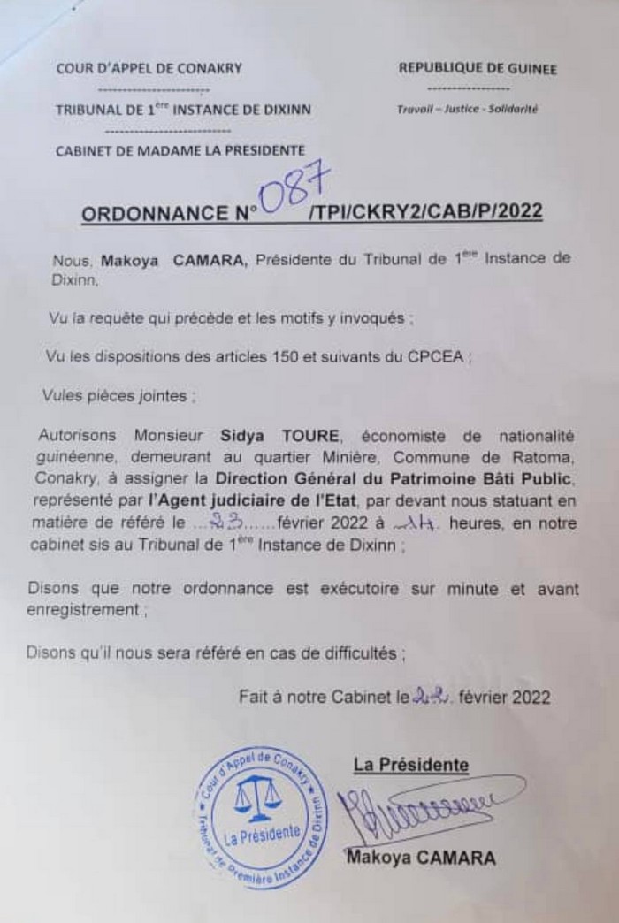 Dans une ordonnance en date de ce mardi 22 février 2022, le cabinet de la présidente du tribunal de première instance de Dixinn autorise l’ancien premier ministre à assigner l’Etat afin de statuer sur sa requête en matière de référé le 23 février 2022 à partir de 14 heures.