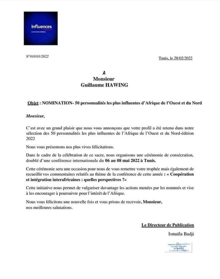 Dans un courrier signé de monsieur Ismaëla Badji, il a été notifié à monsizur Guillaume Hawing, ministre de l’enseignement pré-universitaire et de l’alphabétisation, de sa nomination parmi les personnalités les plus influentes de l’Afrique de l’ouest et du Nord.