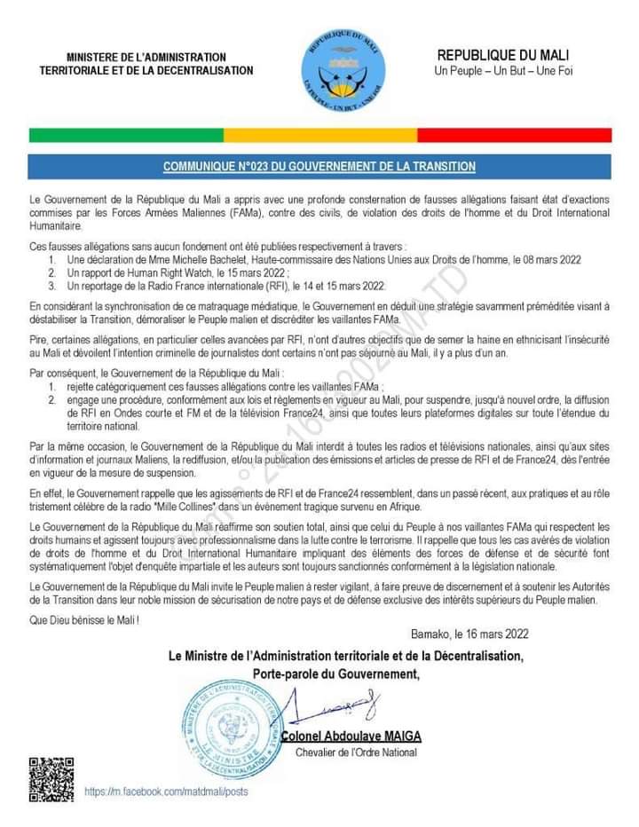 D’une levée matinale, le Mali a fait un communiqué colérique contre ces deux médias qu’il accuse d’avoir diffusé des folles rumeurs sur son armée, le droit international et humanitaire.