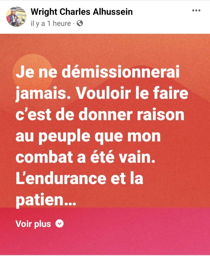 Moins de 24 heures après sa suspension avec effet immédiat, pour faute disciplinaire par le ministre de la Justice, le procureur général près la Cour d’Appel de Conakry Charles Wright annonce pour veulent le partir quil ne démissionnera jamais. Une annonce qu’il a fait à travers son compte Facebook.