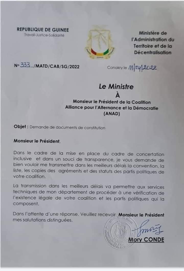 Le ministre Mory Condé note dans ce courrier que la transmission desdits documents permettra aux services légués à son département a vérifier l’existence légale de celle-ci et des partis qui la composent.