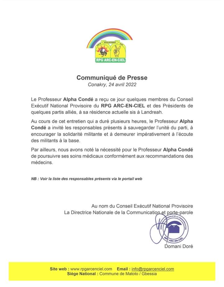 C’est officiel. Annoncé être libre de recevoir depuis sa résidence, et libre de ses mouvements, Alpha Condé a reçu ce dimanche 24 avril 2022, quelques responsables du RPGArc-en-ciel dont Nantou Chérif, Amadou Damaro Camara, Naby Youssouf Kiridi, Domani Doré, Bantama Sow, etc…