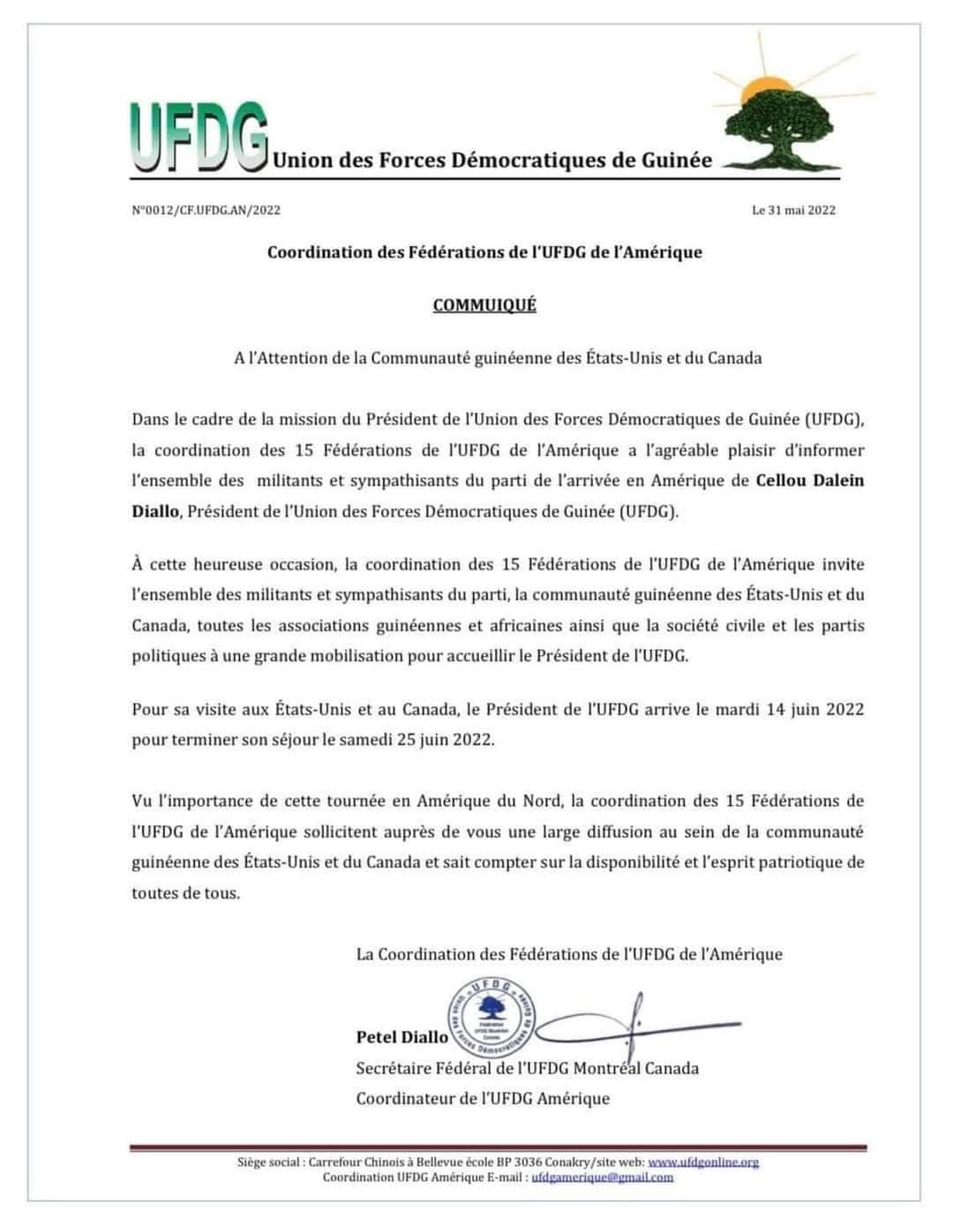 Dans un communiqué signé du secrétaire fédéral de l’UFDG Montreal, Coordinateur de l’UFDG Amérique à la date d’hier mardi 31 mai, il est notifié que Cellou Dalein arrivera aux USA le mardi 14 Juin 2022, pour un séjour qui se terminera le samédi 25 juin2022.