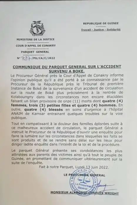 Aussitôt informé du drame qui s’est passé à Kolaboundji, le procureur général près la cour d’appel de Conakry, Alphonse Charles Wright, a à travers un communiqué rendu public et instruit le procureur de la République près le tribunal de première instance de Boké d’ouvrir une enquête pour faire la lumière sur les circonstances de cet accident qui a coûté la mort à 11 citoyens Guinéens., et de se rendre sans délai sur les lieux pour diriger ladite enquête dans l’intérêt de la loi et de la procédure.
