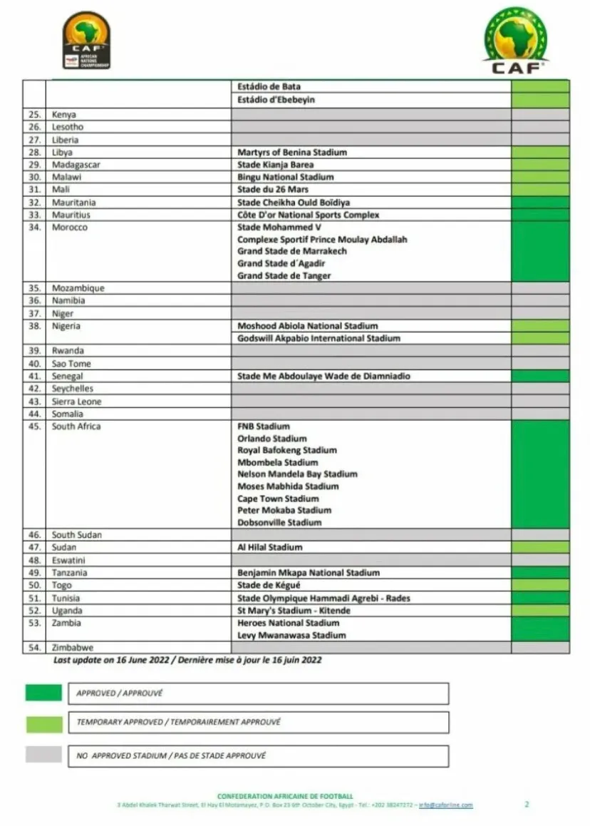 Ci-dessous, la liste des stades validés et les pays privés des leurs: