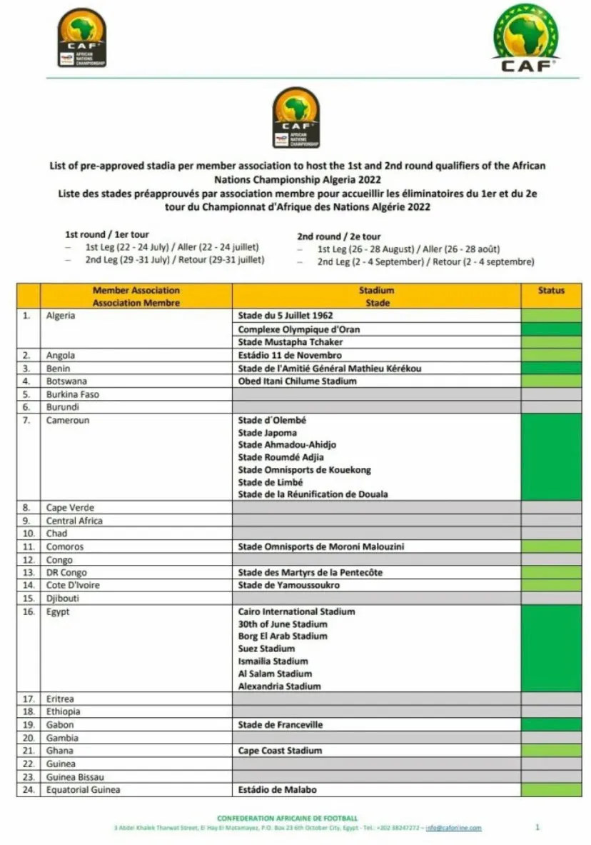 A quelques semaines du premier tour, la CAF a publié la liste des stades homologués. a dévoilé la liste des stades qu’elle a homologués pour les éliminatoires du Championnat d’Afrique des Nations (CHAN) au compte de l’année 2023. Dans cette liste, 26 pays dont la Guinée seront privés de leurs stades pour recevoir les différents matchs.
