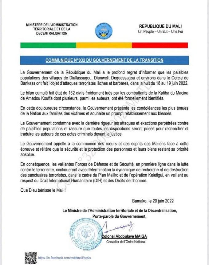 ” Le gouvernement de la République du Mali a le profond regret d’informer que les paisibles citoyens des villages de Dialassagou, Dianweli et Dessagou et environs dans le cercle de Bankass ont fait l’objet d’attaques terroristes lâches et barbares dans la nuit du 18 au 19 juin 2022 », a fait savoir le ministre porte-parole du gouvernement à travers ce communiqué.
