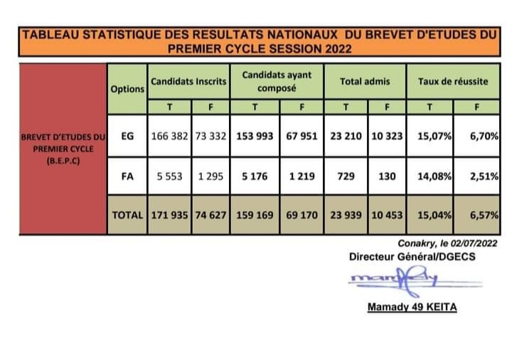 Selon ce tableau statistique des résultats nationaux dudit examen, rendu public par le ministère de l’enseignement pré-universitaire et de l’alphabétisation MEPU-A, ils sont au nombre de 23 939 candidats dont 10 453 filles à décrocher cet examen sur l’ensemble du territoire national, soit 15, 04% du taux d’admission.
