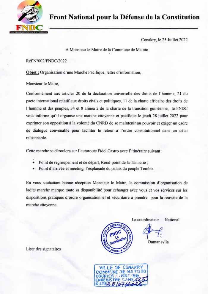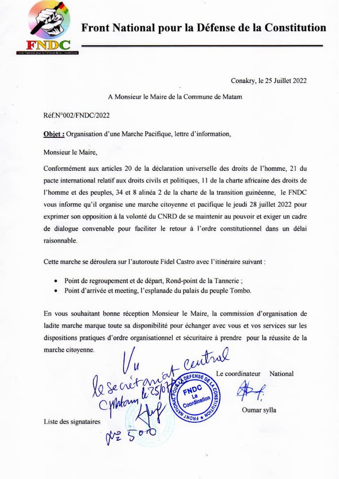 A savoir, les communes de Matoto, Matam et Kaloum. Des lettres dans lesquelles est notifié l’itinéraire de ladite marche.