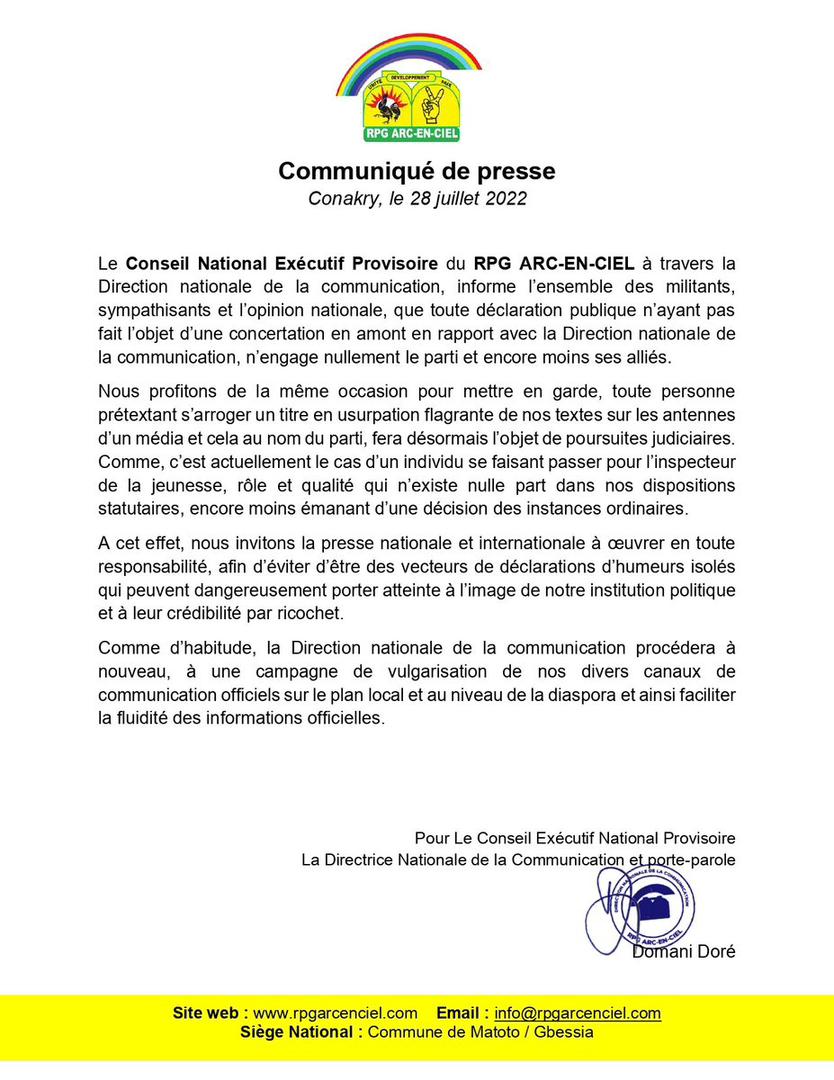 Direction nationale de la communication, informe l’ensemble des militants, sympathisants et l’opinion nationale, que toute déclaration publique n’ayant pas fait l’objet d’une concertation en amont en rapport avec la Direction nationale de la communication, n’engage nullement le parti et encore moins ses alliés.