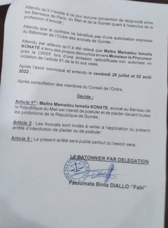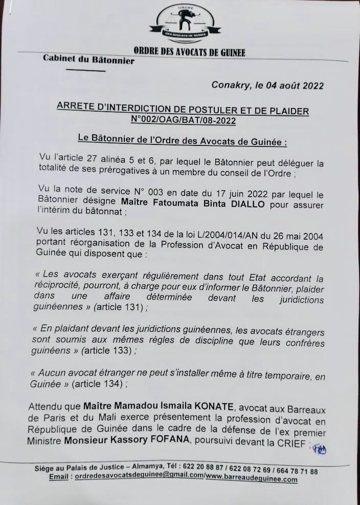Dans une note parvenue à notre rédaction dans la soirée de ce vendredi, 05 août, le Barreau de Guinée interdit à Me Mamadou Ismaila KONATE, un des avocats de l’ancien premier ministre Guinéen, Dr Ibrahima Kassory Fofana de postuler et de plaider en Republique de Guinée.