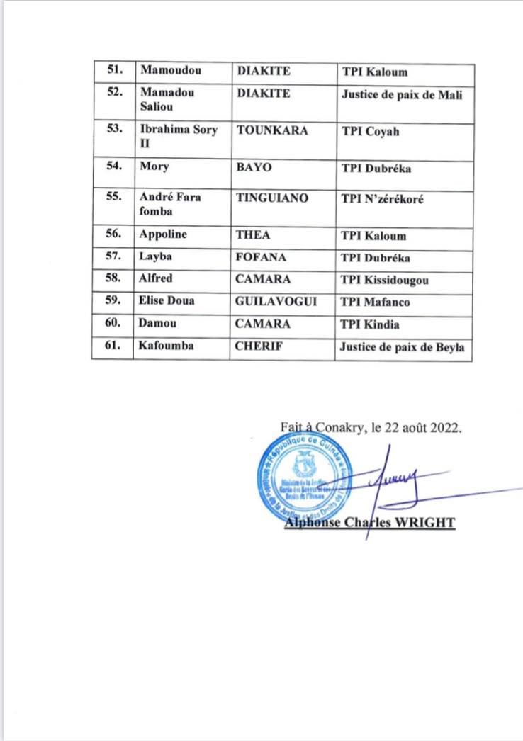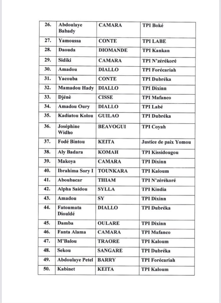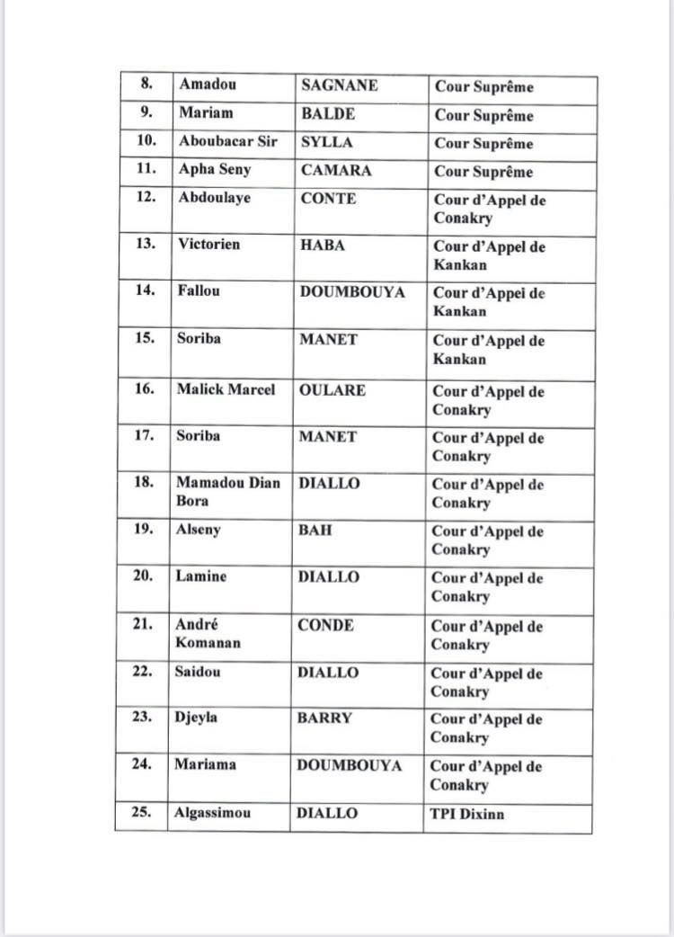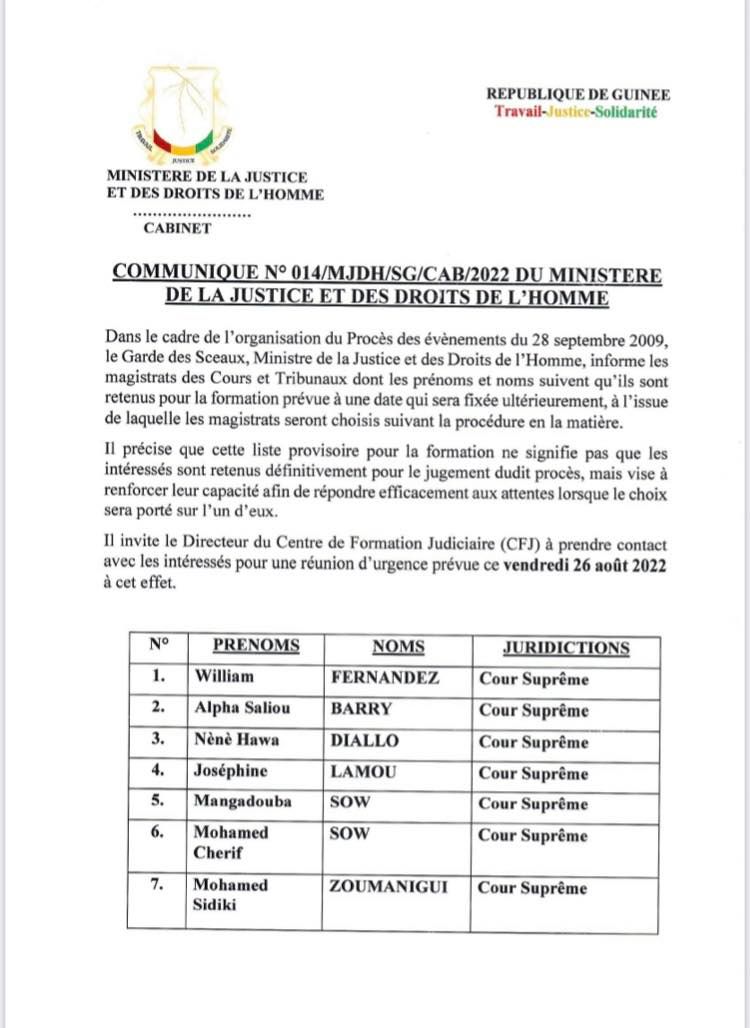 Dans le cadre de l’organisation du procès des événements du 28 septembre 2009, le Garde des Sceaux, Ministre de la Justice et des Droits de l’Homme, informe les magistrats des Cours et Tribinaux dont les prénoms et noms suivent qu’ils sont retenus pour la formation prévue à une date qui sera fixée ultérieurement, …