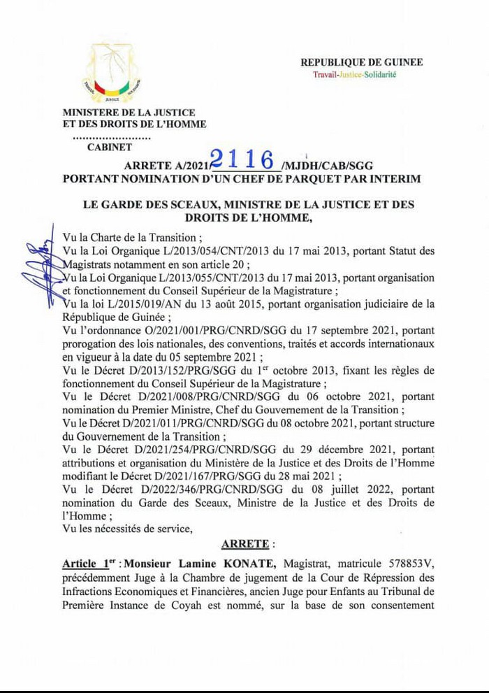Dans un arrêté daté du du 25 août 2022, Alphonse Charles Wright, ministre de la justice et le garde des sceaux a procédé au remplacement du juge Mohamed Diawara qu’il avait suspendu aux fonctions de procureur près le tribunal pour enfant, en le remplaçant par Monsieur Mohamed Lamine Konaté, magistrat.