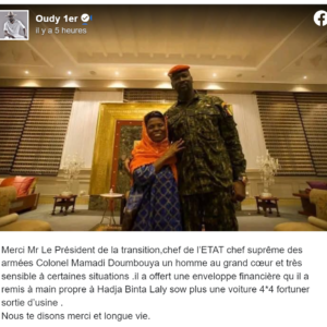 ” Merci Mr Le Président de la transition,chef de l’ETAT chef suprême des armées Colonel Mamadi Doumbouya un homme au grand cœur et très sensible à certaines situations .il a offert une enveloppe financière qu il a remis à main propre à Hadja Binta Laly sow plus une voiture 4*4 fortuner sortie d’usine .