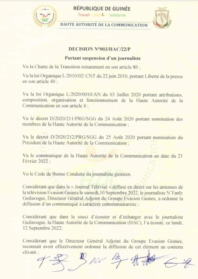 Dans une note, la Haute Autorité de la Communication (HAC) a adressé un avertissement contre le groupe Evasion Guinée et suspend le journaliste Nfallya Guillavogui poir une période de 10 jours, pour motifs donné, la diffusion des propos non autorisées par les principes et règles de l’institution de régulation de la communication en Guinée.