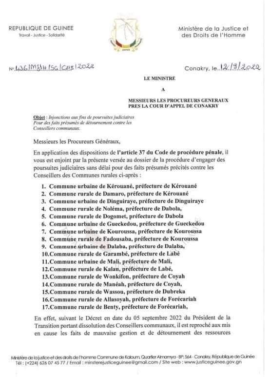 Le ministre de la justice et de garde des sceaux a saisi le procureur général près la cour d’appel de Conakry d’une information aux fins de poursuite judiciaire contre dix-sept (17) conseils communaux pour mauvaise gestion.