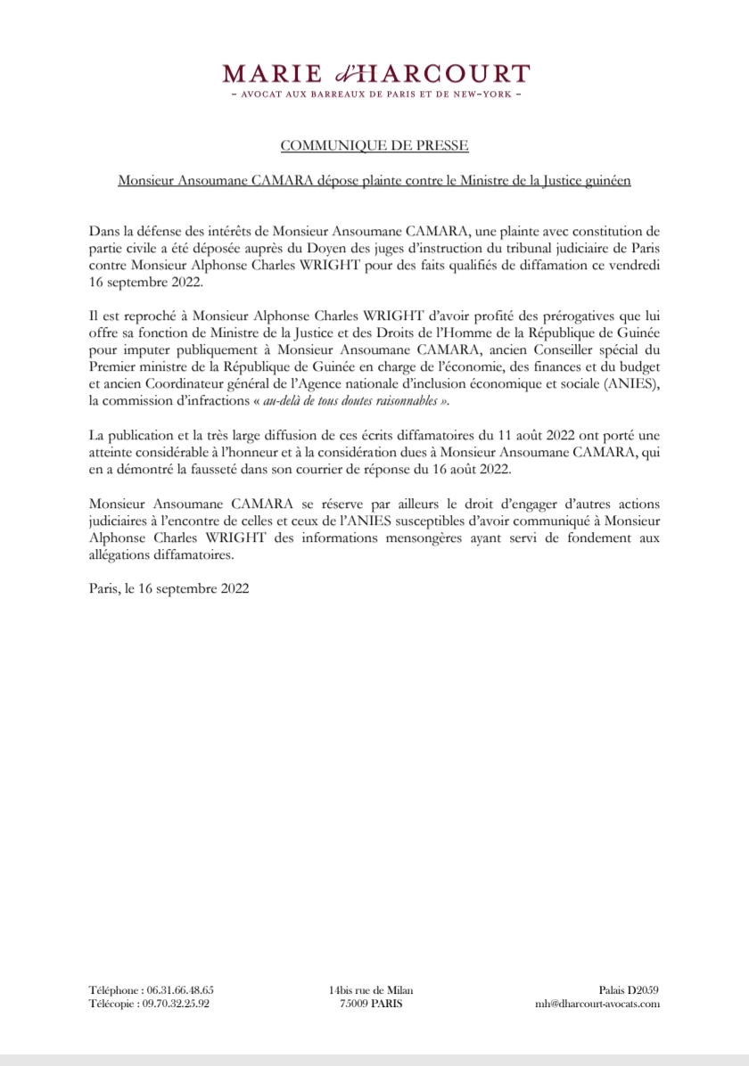 A travers un ommuniqué de presse parvenu à notre rédaction, monsieur Ansoumane Camara, ancien Conseiller Spécial à la Primature, chargé de l’économie, des finances et du budget et ancien cordinateur de l’Agence national d’inclusion économique et sociale (ANIES), a déposer une plainte contre le ministre de la justice Guinéenne, Alphone Charles Wright pour des faits de deiffamation auprès du Doyen des juges d’instruction du tribunal judiciaire de Paris.