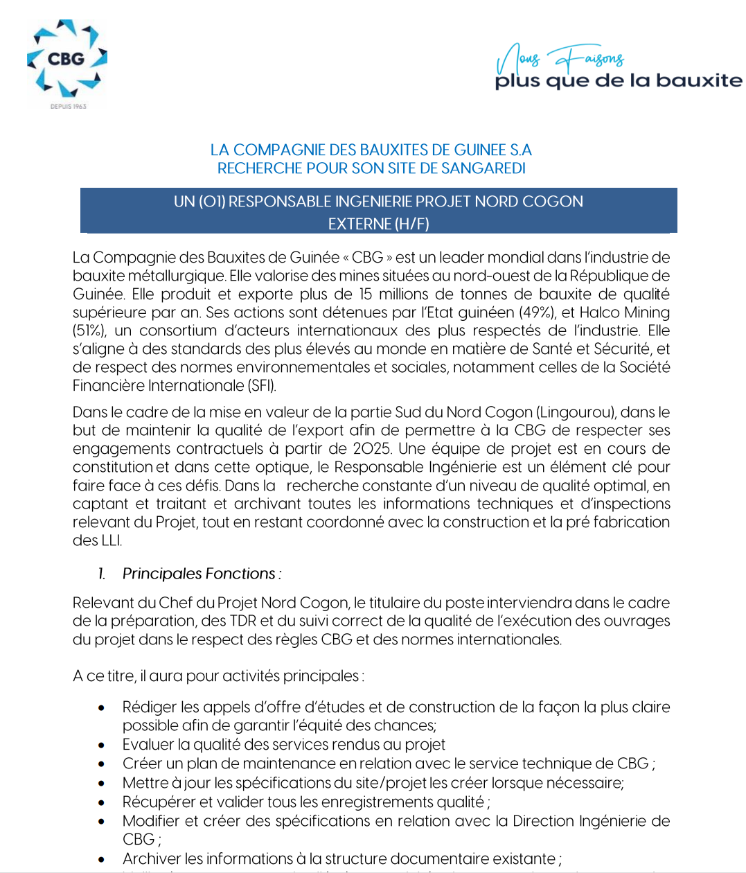La CBG (compagnie des bauxites de Guinée), un des leaders de l’industrie bauxitique mondiale, souhaite recruter un gestionnaire contrat de son projet Nord Cogon, pour son site de Sangaredi.