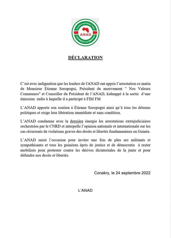 C’est avec indignation que les leaders de l’ANAD ont appris l’arrestation ce matin de Monsieur Étienne Soropogui, Président du mouvement ” Nos Valeurs Communes” et Conseiller du Président de l’ANAD, kidnappé à la sortie d’une émission radio à laquelle il a participé à FIM FM