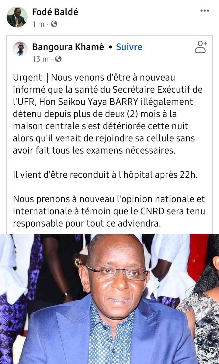 ” Nous venons d’être à nouveau informé que la santé du Secrétaire Exécutif de l’UFR, Hon Saikou Yaya BARRY illégalement détenu depuis plus de deux (2) mois à la maison centrale s’est détériorée cette nuit alors qu’il venait de rejoindre sa cellule sans avoir fait tous les examens nécessaires.