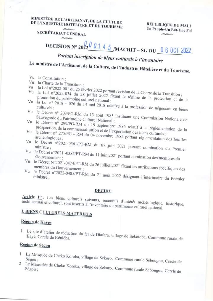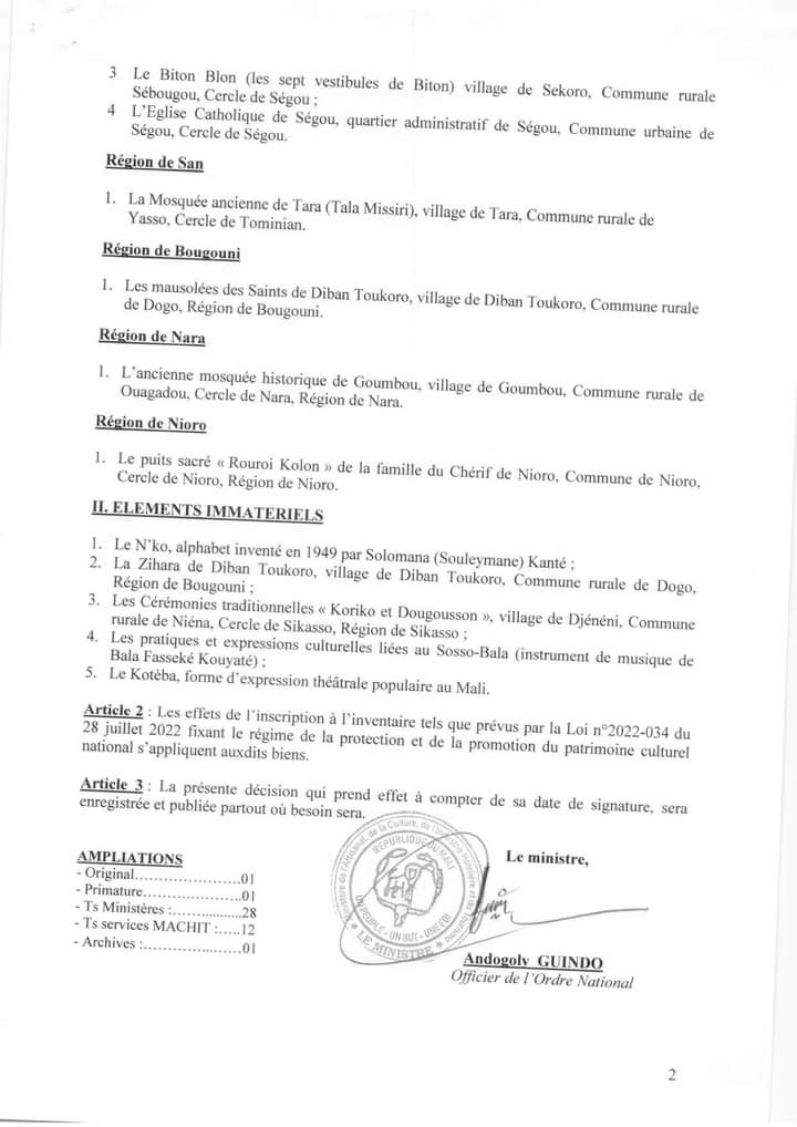 L’écriture n’ko classée sur la liste du patrimoine immatériel du Mali (copie de la décision ministérielle)