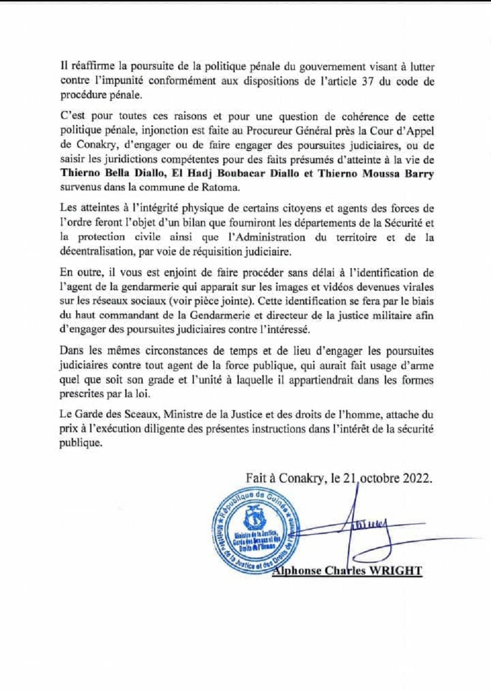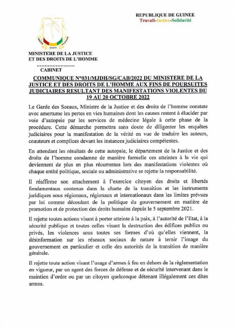 Dans un communiqué qu’il a publié ce vendredi 21 octobre 2022 sur sa page,  Charles Wright, ministre de la Justice et des Droits de l’Homme, contrairement au communiqué du procureur près la cour de Coankry, a parlé de trois (3) morts lors de la manifestation appelée hier par le FNDC, une organisation annoncée dissoute par les aurotités de la transition Guinéennes.  Un communiqué dans lequel, le département de la justice dit condamné de manière formelle, les atteintes à la vie qui déviennent de plus en plus reccurentes lors des manifestations violentes ou chaque entité politique, sociale ou administratives se rejette la responsabilité.