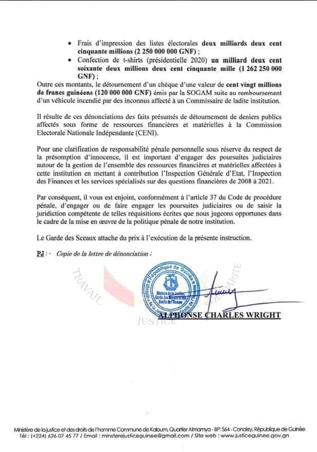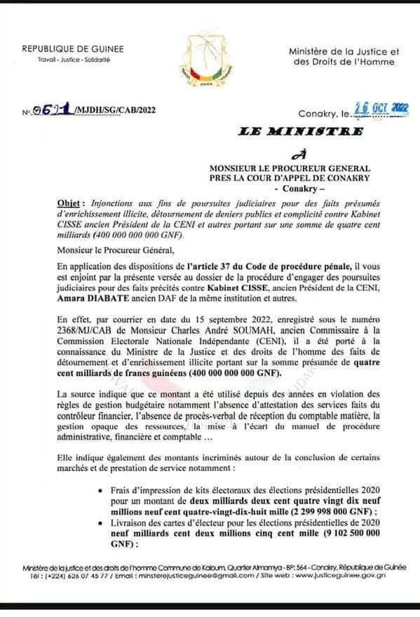 Le ministre de la justice Guinéenne, Alphonse Charles Wright a ordonné ce mercredi 26 octobre 2022, des poursuites judiciaires contre l’ancien président de la CENI, Kabinet Cissé et l’ancien DAF de la même institution Amara Diabaté, pour des faits présumés d’enrichissement illicite et de détournement de deniers publics.